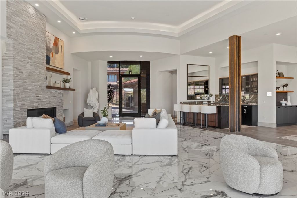 Lake Las Vegas: Where luxury, nature, golf, water, and mountains converge. Rare masterpiece perched on a 1.35-acre elevated hilltop?a true single-story with no transitions. Wide-open sophisticated design, crafted with top-tier finishes. Striking pivot door that opens up to lake, mountain, & sunset views with floor-to-ceiling pocket doors, a steel beam, and a stone fireplace. Resort-style negative edge 848 sqft saltwater pool with wet deck, party spa, pool bath & shower, and a firepit. The open kitchen has leathered quartz countertops, walnut details, and navy cabinets. 5 ensuite bedrooms with split layout. Primary has a walnut fireplace, a luxury closet, a steam shower, & walk-in tub. Flex room ideal as gym/office/spa. 4-car climate-controlled garage, free golf cart, generator, roll-down shutters. Lives like a private resort on one of the largest lots behind a secure guard gate and a secondary gate. Luxury living with tax benefits, endless views and adventure right outside your door.