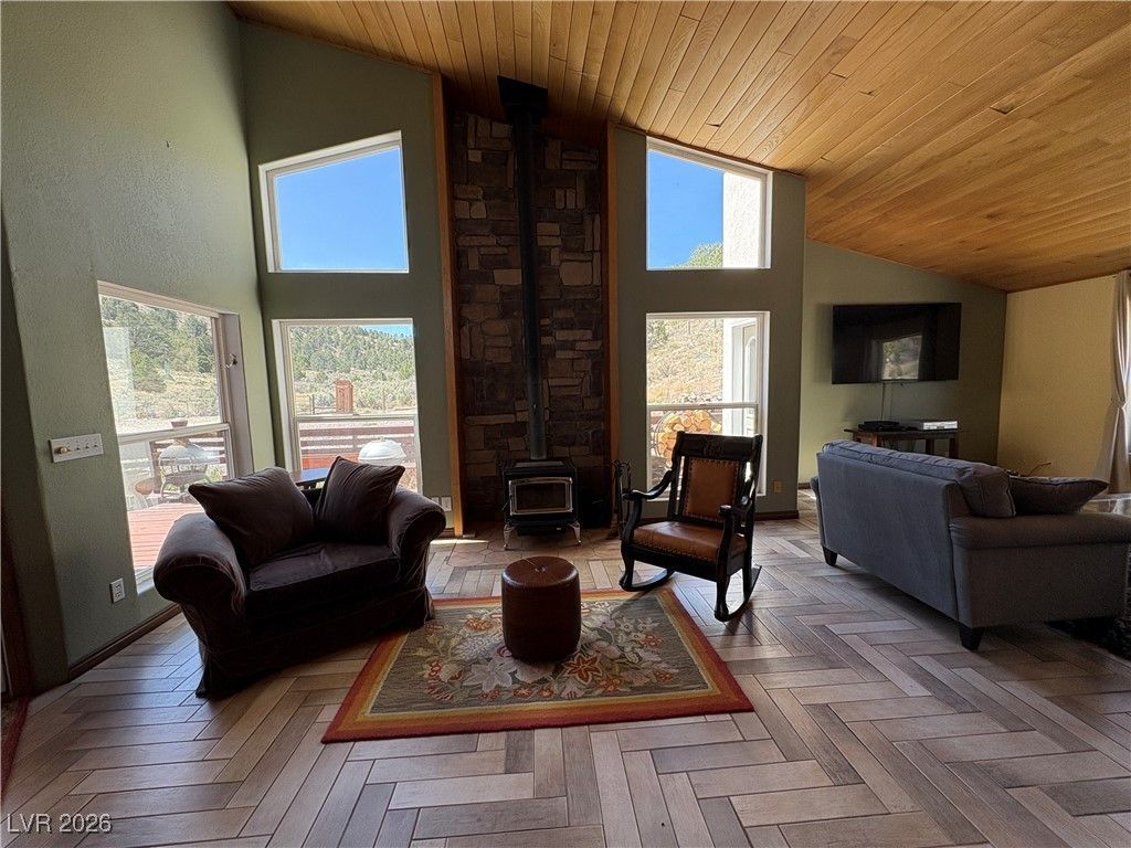 Beautiful stucco home perfectly located close to town yet secluded and private on 13+ acres. This exquisite home has an open floor plan featuring expansive vaulted pine ceilings, wet bar, wood burning fireplace with rock chimney accent and stunning views. The open kitchen is conveniently located in the center of the home perfect for gathering. The primary suite is separate from the other bedrooms with 2 walk-in closets and a magnificent private bath boasting a large tiled walk-in shower, jacuzzi tub, and double sinks. In addition to the 2 bedrooms and bath located on the opposite side of the home there is a completely separate private guest suite with a sitting area and its own bath. The large partially covered back deck is great for BBQ's and enjoying the privacy and sprawling views. This is a one level home no stairs! There is also a large shop located on the property perfect for RV storage or hobby shop. Partially furnished and ready to move in. A must see for qualified buyers.