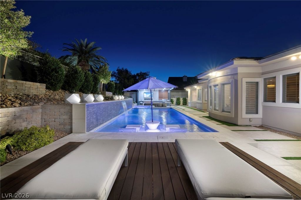 Exquisitely remodeled single-story home on a large 1/3-acre lot in the prestigious guard gated - Estates at Green Valley Ranch. Designed for modern luxury living, this impeccable residence features 10-foot ceilings and a bright open floor plan ideal for entertaining. The chef's kitchen is a showpiece with professional Viking appliances, sleek quartz countertops, and a waterfall-edge island. The spacious primary retreat offers a spa-inspired bath and large custom walk-in closet. Step outside to an impressive resort-style backyard featuring a large modern step-up in-ground pool/spa with heat-proof Turkish limestone throughout, perfect for Vegas summers. A 4K cantilevered entertainment area, built-in BBQ, gas fire-pit lounge, and raised thermory wood deck complete the outdoor space. Easy access to I-215 with just a 12 min drive to the airport. Close to excellent schools, beautiful parks, biking/walking trails, library, multigenerational center, The District and Green Valley Ranch Resort.